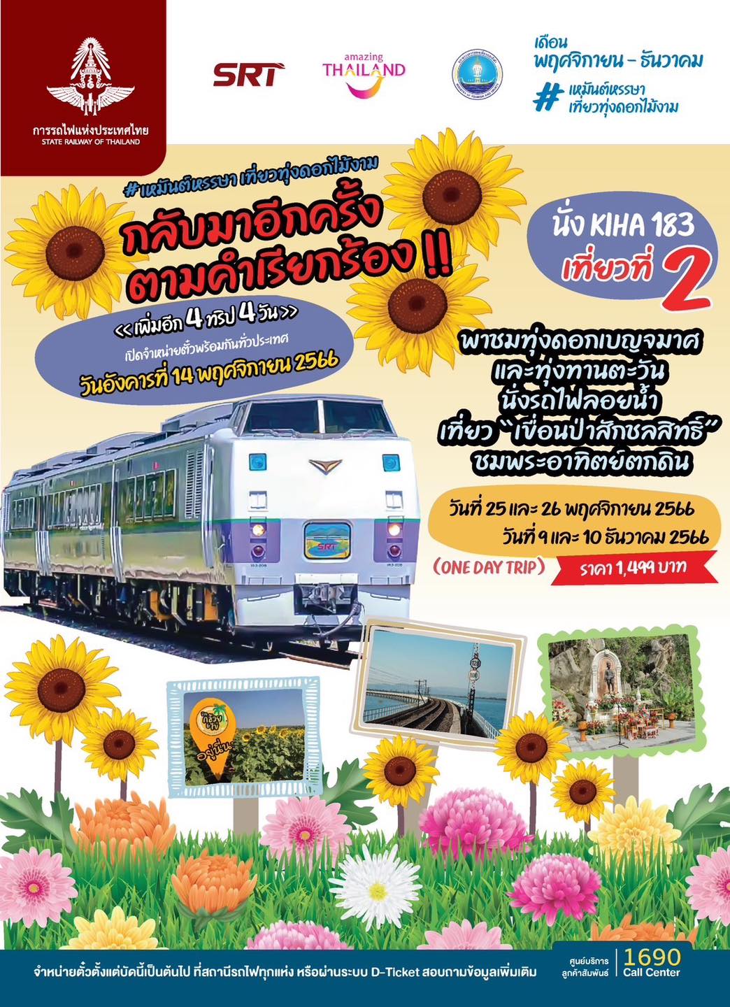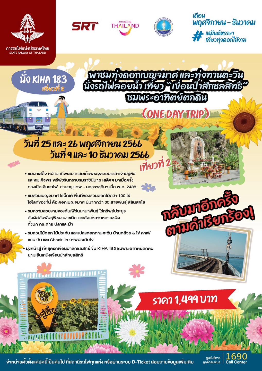 โปรแกรมนั่งรถไฟ KIHA 183 พาชมทุ่งดอกเบญจมาศและทุ่งทานตะวัน นั่งรถไฟลอยน้ำ เที่ยวเขื่อนป่าสักชลสิทธิ์ พาชมพระอาทิตย์ตกดิน แวะผาเสด็จ ชมความงามของดอกเบญจมาศ ณ สวนเบญจมาศ ไร่บิ๊กเต้ และต้นเฟิร์นนานาพันธุ์ ณ ไร่ทรัพย์ประยูร ชมสวนไม้ดอก ไม้ประดับ และแปลงดอกทานตะวัน บ้านกล้วย & ไข่คาเฟ่ และสัมผัสพระอาทิตย์ตกดินยามเย็นเหนือเขื่อนป่าสักชลสิทธิ์