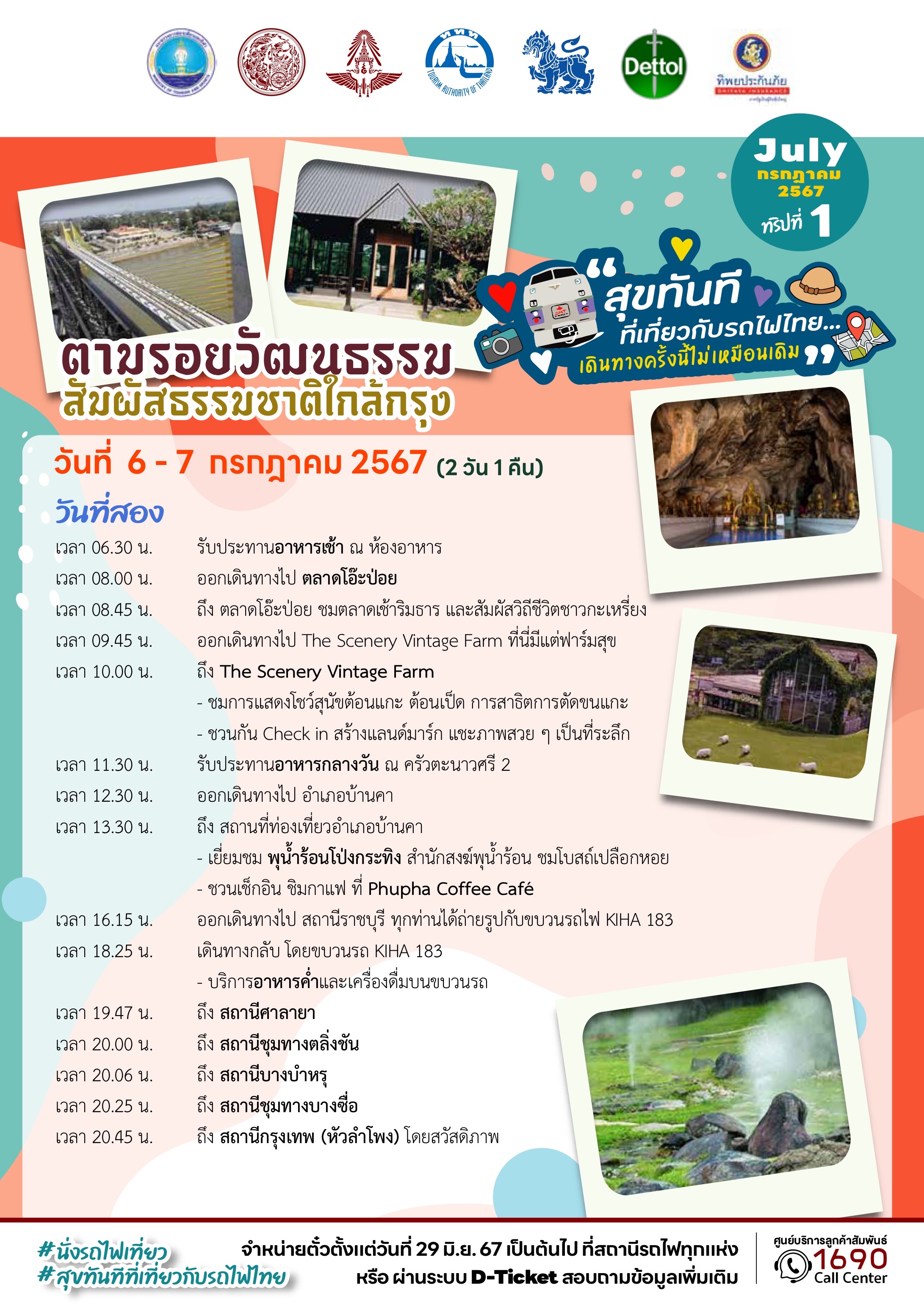 สำหรับผู้ที่สนใจจองโปรแกรมท่องเที่ยวทั้ง 6 เส้นทาง สามารถซื้อตั๋วได้ตั้งแต่วันที่ 29 มิถุนายน 2567 เวลา 08.30 น. เป็นต้นไป ที่สถานีรถไฟทั่วประเทศหรือผ่านระบบออนไลน์ D-ticket ของการรถไฟแห่งประเทศไทย หรือสามารถสอบถามเพิ่มเติมได้ที่ ศูนย์บริการลูกค้าสัมพันธ์ การรถไฟแห่งประเทศไทย 1690